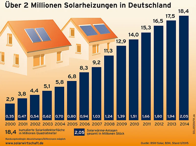 Dies teilen aktuell der Bundesindustrieverband Deutschland Haus-, Energie- und Umwelttechnik (BDH) und der Bundesverband Solarwirtschaft (BSW-Solar) mit. Im Jahr 2014 wurden demnach auch bundesweit rund 112.000 neue Solarwärmeanlagen mit einer Gesamtkollektorfläche von 900.000 m² installiert. Insgesamt sollen es inzwischen 18,4 Mio m² sein.
