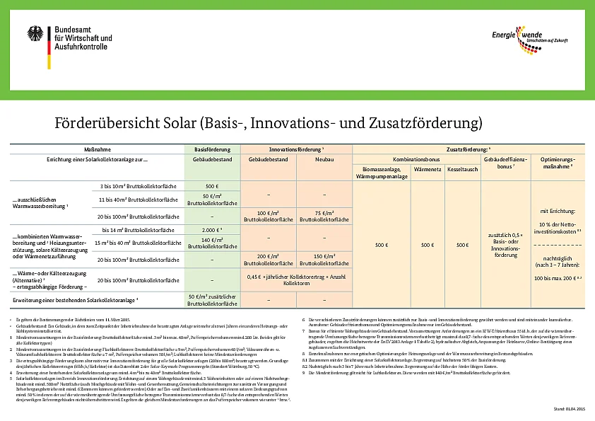 Anträge für die Förderung nach den neuen Richtlinien werden voraussichtlich ab dem 01.04.2015 vom BAFA zur Verfügung gestellt. Alle Anträge, die bis zum 31.03.2015 dort eingehen, werden nach den aktuell geltenden Richtlinien vom 20. Juli 2012 entschieden.