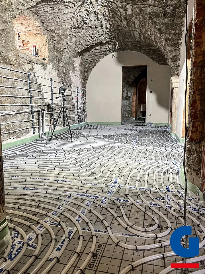 Auf dieser Baustelle sieht man besonders gut, wie moderne Haustechnik und jahrhundertealte Architektur zusammenpassen können. In einem historischen Gewölbekeller wurde von unserem Team eine energieeffiziente Fußbodenheizung installiert.