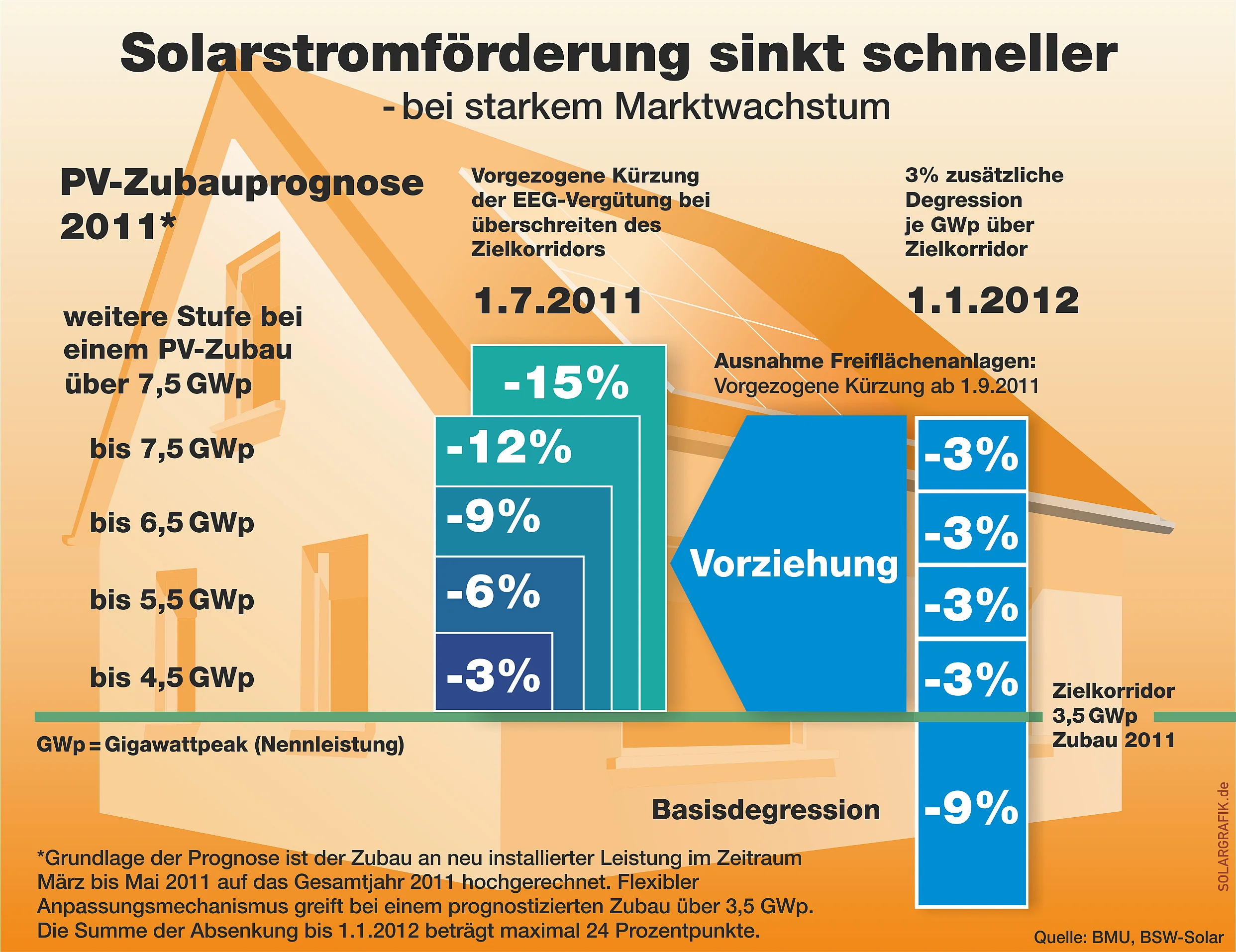 Die für Anfang 2012 geplante und bereits 2010 gesetzlich festgeschriebenen marktzubauabhängigen Degressionsschritte können bei hoher Nachfrage vom 1.1.2012 auf den 1. Juli 2011 ganz oder in Teilen vorgezogen werden. Bei einem prognostizierten Ausbau von bis zu 3,5 GW wird auf ein Vorziehen verzichtet.