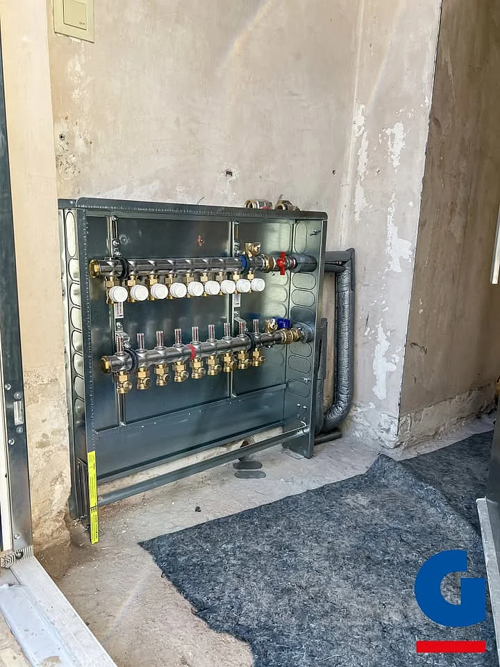 Hier entsteht gerade die Verteilung einer modernen Fußbodenheizung – präzise montiert, übersichtlich aufgebaut und optimal auf das Gebäude abgestimmt. Genau so legen wir den Grundstein für gleichmäßige Wärme und effizienten Betrieb.
