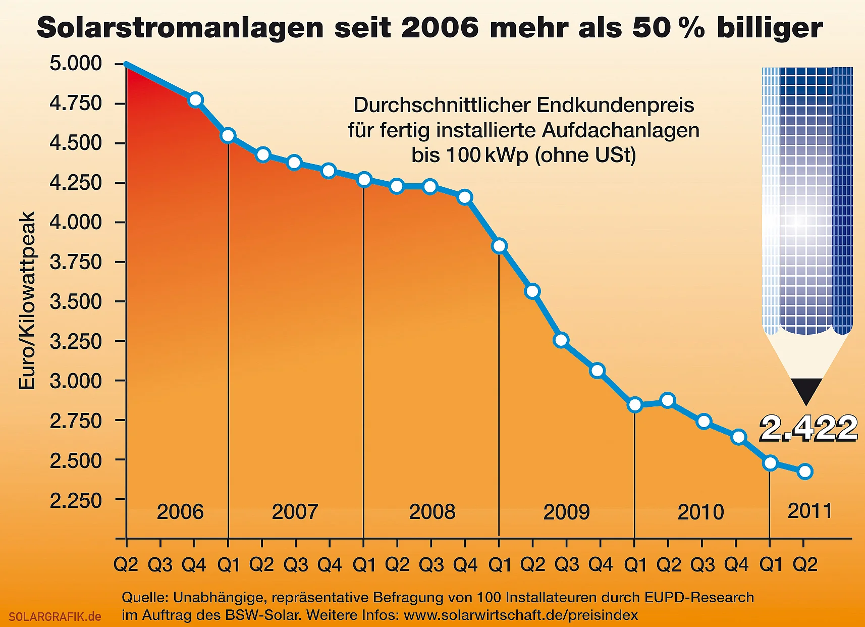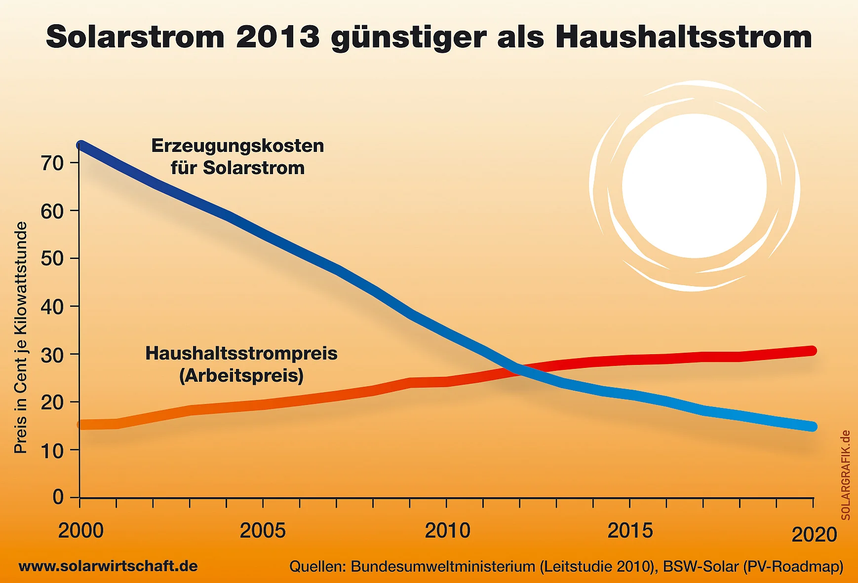Dies ergeben Berechnungen der Beratungsunternehmen Roland Berger und Prognos. Nach Überzeugung vieler Energieexperten besitzt die Photovoltaik das Potenzial, zu einer der günstigsten Energie-Erzeugungsformen überhaupt zu werden. Schon 2014 erreicht Solarstrom aus großen Solarstromanlagen das Förderniveau von Windkraftanlagen auf dem Meer (Offshore).